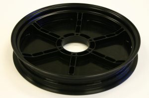 These wheels were made for a solar-powered car which competed in the World Solar Challenge. This is a race held every two years from Darwin, Australia to Adelaide, crossing the continent north-south, a distance of 1,878 miles. The wheels are 17″ (432 mm) in diameter weigh 4.8 lb (2.2 kg) each. They are machined from solid 6061-T6 aluminum plate. All machining is done on the CNC mill, with a cycle time of 16 hours per wheel.